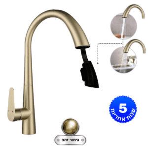 • ברז נשלף ניצב לכיור מטבח פיה קשתית גבוהה גימור זהב