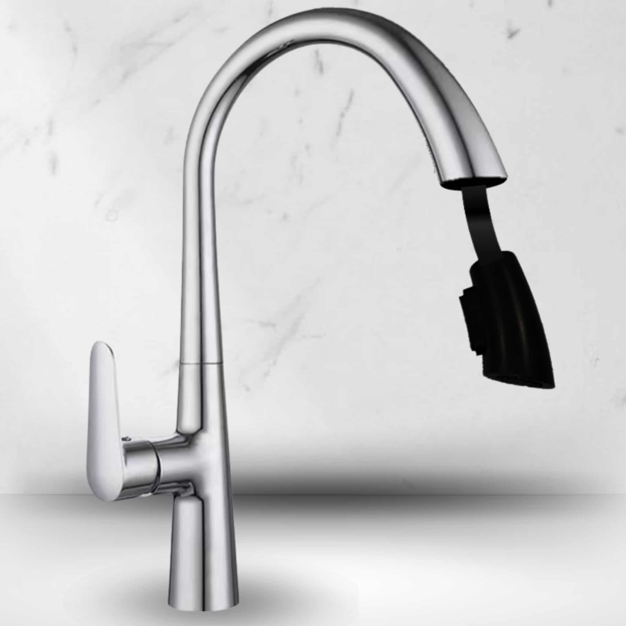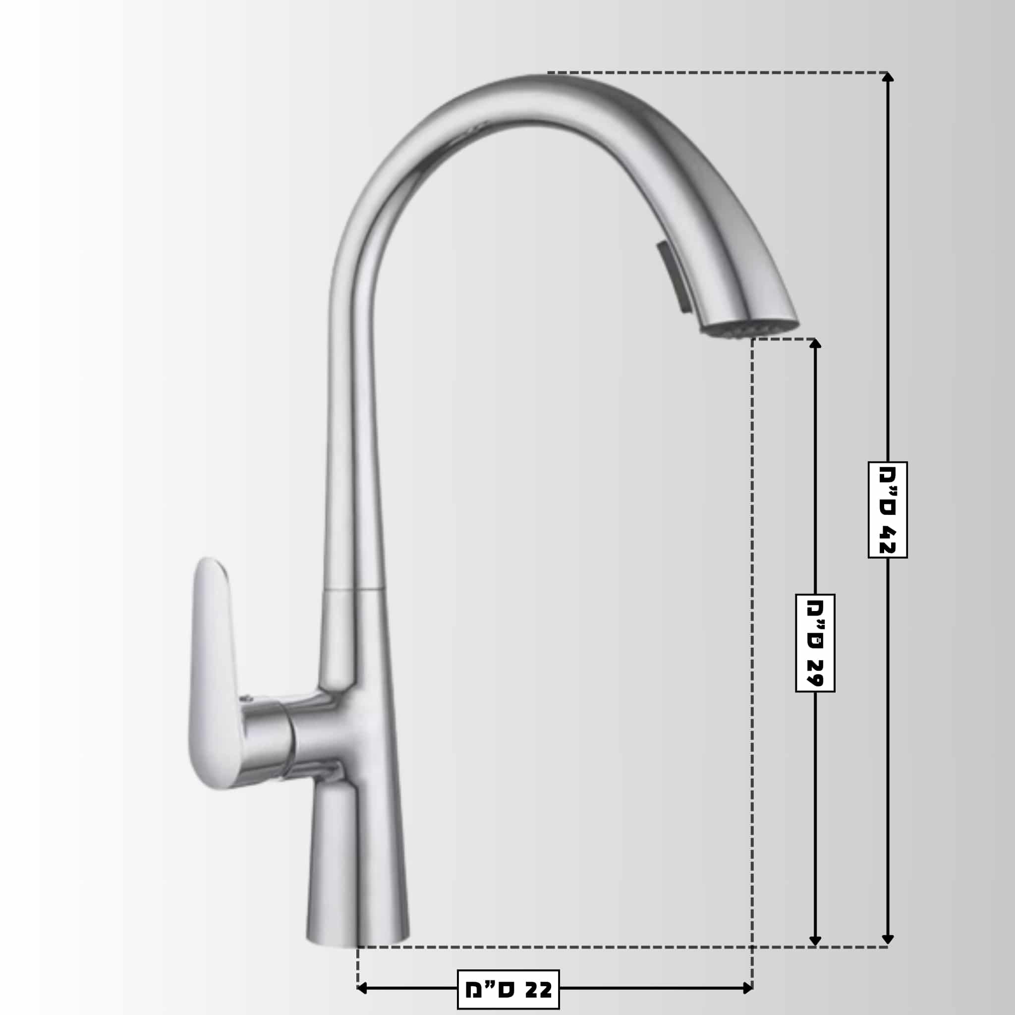 ברז נשלף ניצב לכיור מטבח פיה קשתית גבוהה גימור כרום מוברש