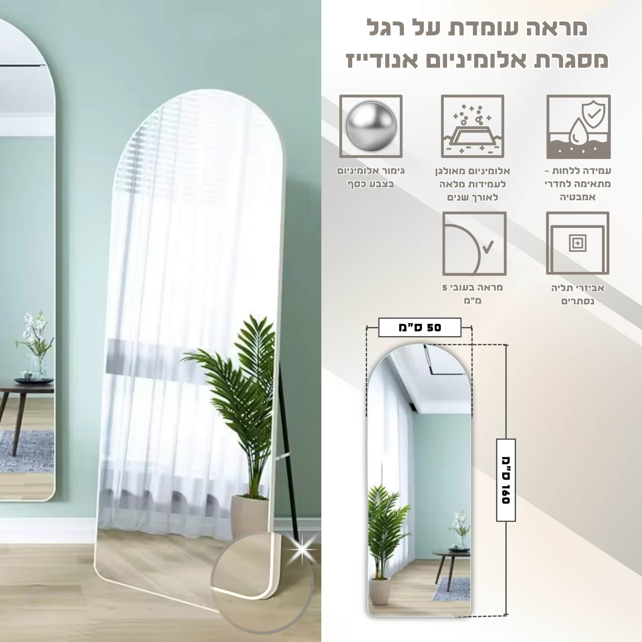 מראה עומדת על רגל עם מסגרת אלומיניום אנודייז