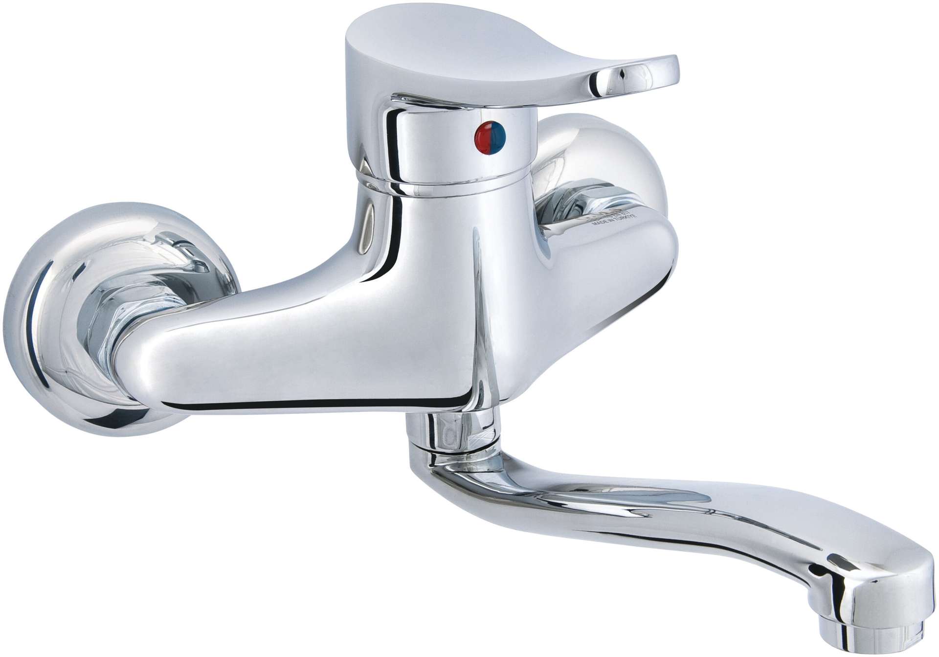 סוללת ברז קיר עם פיה תחתונה ארוכה מסתובבת.